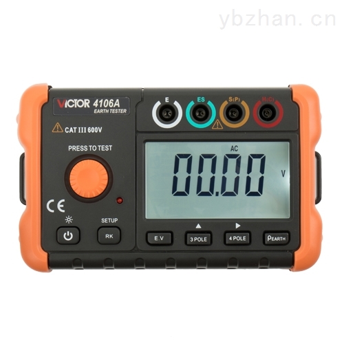 VICTOR 4106A 接地电阻测试仪 是一款多功能的智能接地电阻测试仪。采用传统的打地桩方式来测量接地电阻,可以选择3极法、4极法测量;也可以测量土壤电阻率。